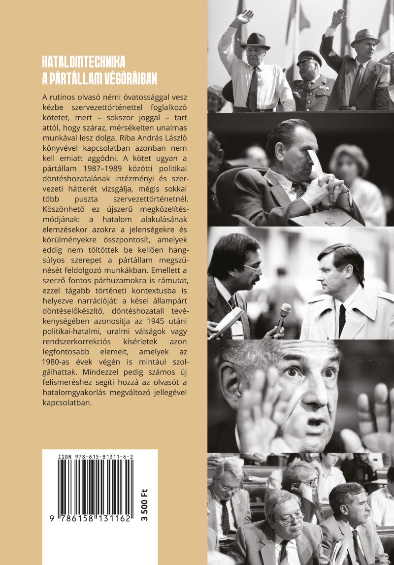 A rutinos olvasó némi óvatossággal vesz kézbe szervezettörténettel foglalkozó kötetet, mert – sokszor joggal – tart attól, hogy száraz, mérsékelten unalmas munkával lesz dolga. Riba András László könyvével kapcsolatban azonban nem kell emiatt aggódni. A kötet ugyan a pártállam 1987–1989 közötti politikai döntéshozatalának intézményi és szervezeti hátterét vizsgálja, mégis sokkal több puszta szervezettörténetnél. Köszönhető ez újszerű megközelítésmódjának: a hatalom alakulásának elemzésekor azokra a jelenségekre és körülményekre összpontosít, amelyek eddig nem töltöttek be kellően hangsúlyos szerepet a pártállam megszűnését feldolgozó munkákban. Emellett a szerző fontos párhuzamokra is rámutat, ezzel tágabb történeti kontextusba is helyezve narrációját: a kései állampárt döntéselőkészítő, döntéshozatali tevékenységében azonosítja az 1945 utáni politikai-hatalmi, uralmi válságok vagy rendszerkorrekciós kísérletek azon legfontosabb elemeit, amelyek az 1980-as évek végén is mintául szolgálhattak. Mindezzel pedig számos új felismeréshez segíti hozzá az olvasót a hatalomgyakorlás megváltozó jellegével kapcsolatban.