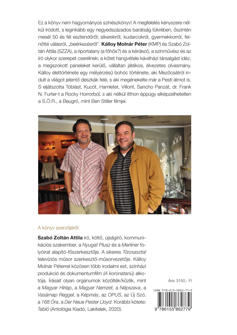 Ez a könyv nem hagyományos színészkönyv! A megfelelés kényszere nélkül íródott, s leginkább egy negyedszázados barátság tükrében, őszintén mesél 50 és fél esztendőről; sikerekről, kudarcokról, gyermekkorról, felnőtté válásról, „beérkezésről”. Kálloy Molnár Péter (KMP) és Szabó Zoltán Attila (SZZA), a riportalany (a főhős?) és a kérdező, a színművész és az író olykor szerepet cserélnek; a kötet hangvétele kávéházi társalgást idéz, a megszokott paneleket kerülő, vállaltan játékos, élvezetes olvasmány.