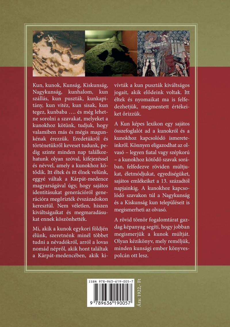 Könnyen eligazodhat az olvasó – legyen fiatal vagy szépkorú – a kunokhoz kötődő szavak sorában, felfedezve röviden múltjukat, életmódjukat, egyediségüket, sajátos emlékeiket a 13. századtól napjainkig. A kunokhoz kapcsolódó szavakon túl a Nagykunság és a Kiskunság kun településeit is megismerheti az olvasó. A rövid tömör fogalomtárat gazdag képanyag segíti, hogy jobban megismerjük a kunok múltját. Olyan kézikönyv, mely reméljük, minden kunsági ember könyvespolcán ott lesz.