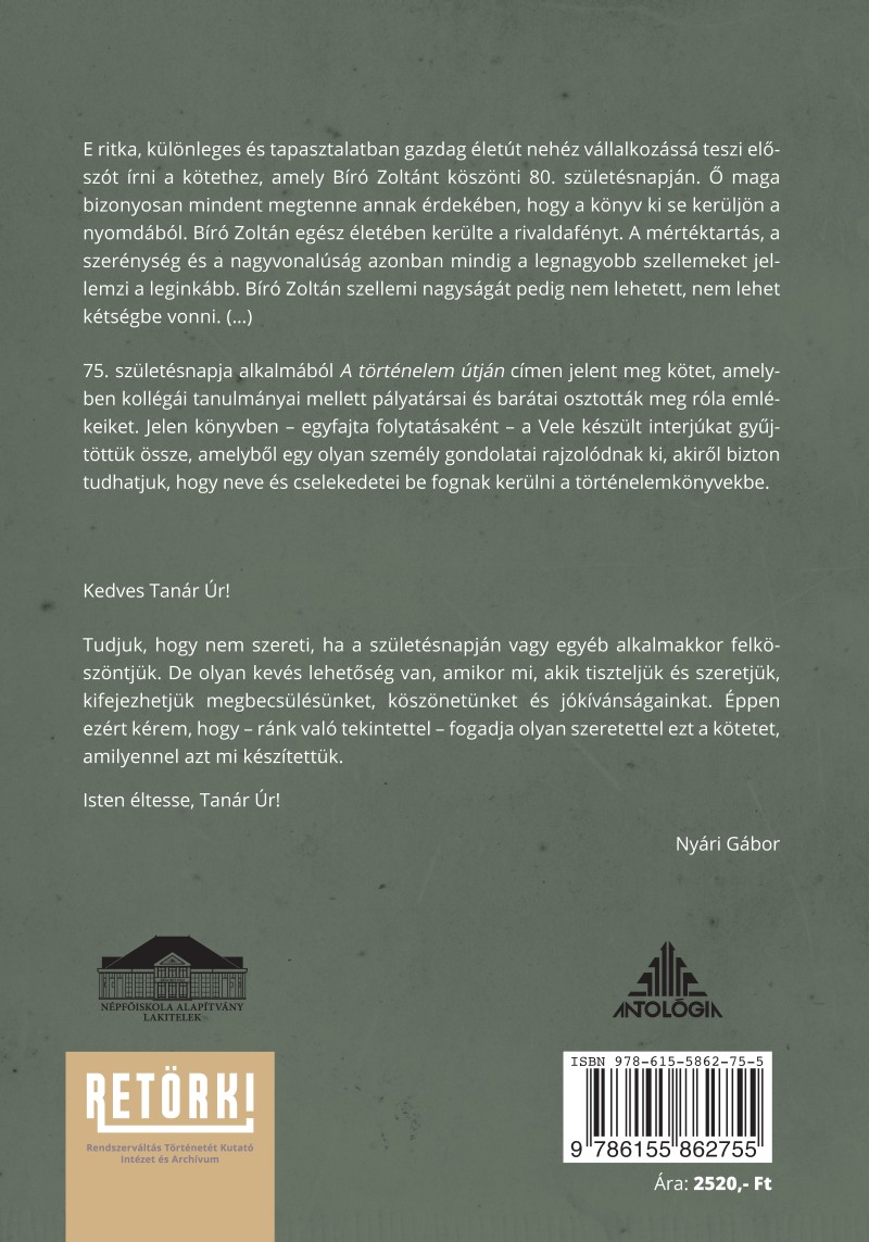 E ritka, különleges és tapasztalatban gazdag életút nehéz vállalkozássá teszi előszót írni a kötethez, amely Bíró Zoltánt köszönti 80. születésnapján. Ő maga bizonyosan mindent megtenne annak érdekében, hogy a könyv ki se kerüljön a nyomdából. Bíró Zoltán egész életében kerülte a rivaldafényt. A mértéktartás, a szerénység és a nagyvonalúság azonban mindig a legnagyobb szellemeket jellemzi a leginkább. Bíró Zoltán szellemi nagyságát pedig nem lehetett, nem lehet kétségbe vonni. (…) 75. születésnapja alkalmából A történelem útján címen jelent meg kötet, amelyben kollégái tanulmányai mellett pályatársai és barátai osztották meg róla emlékeiket. Jelen könyvben – egyfajta folytatásaként – a Vele készült interjúkat gyűjtöttük össze, amelyből egy olyan személy gondolatai rajzolódnak ki, akiről bizton tudhatjuk, hogy neve és cselekedetei be fognak kerülni a történelemkönyvekbe.