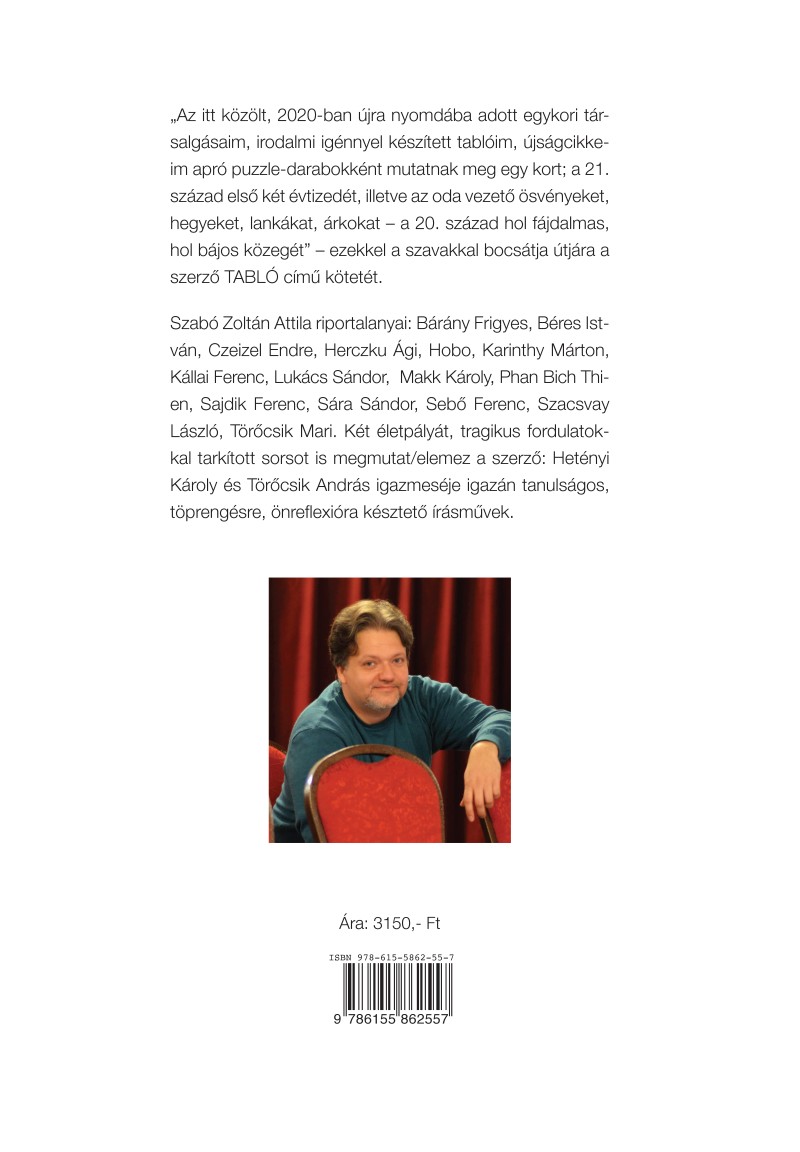 „Az itt közölt, 2020-ban újra nyomdába adott egykori társalgásaim, irodalmi igénnyel készített tablóim,újság cikkeim apró puzzle-darabokként mutatnak meg egy kort; a 21. század első két évtizedét, illetve az oda vezető ösvényeket, hegyeket, lankákat, árkokat –a 20.század hol fájdalmas, hol bájos közegét”–ezekkel a szavakkal bocsátja útjára a szerző Tabló című kötetét.